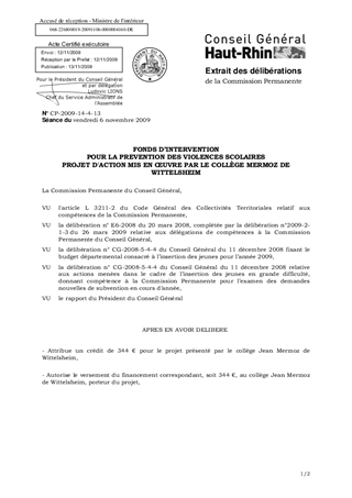 Le Fonds d'Intervention pour la prévention des Violences Scolaires est un dispositif doté de 40 000 € en 2009, destiné à encourager et à soutenir des projets d'actions mis en œuvre dans et aux abords des collèges afin de prévenir les violences scolaires et les incivilités. Dans ce cadre, le collège Jean Mermoz de Wittelsheim présente un projet pour un montant de 344 €. Il est proposé d'autoriser, pour l’action présentée, le versement du financement correspondant au collège porteur de projet.