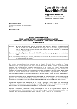 FONDS D’INTERVENTION POUR LA PREVENTION DES VIOLENCES SCOLAIRES PROJET D'ACTION MIS EN ŒUVRE PAR LE COLLÈGE MERMOZ DE WITTELSHEIM