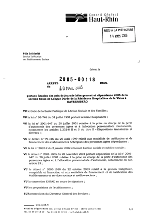 portant fixation des prix de journée hébergement et dépendance 2005 de la section soins de longue durée de la résidence hospitalière de la Weiss à KAYSERSBERG. Resumé Pièces jointes ARRETE Assemblée : Non défini Date : 10/03/2005 Rapporteur : Non défini Collectivité : Conseil départemental du Haut-Rhin Direction : Non défini Service : Service de la Tarification des Etablissements Domaine : Prix de Journée Commission :