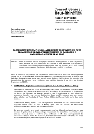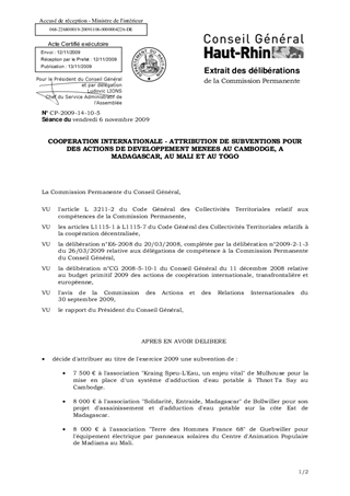 COOPERATION INTERNATIONALE - ATTRIBUTION DE SUBVENTIONS POUR DES ACTIONS DE DEVELOPPEMENT MENEES AU CAMBODGE, A MADAGASCAR, AU MALI ET AU TOGO