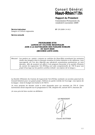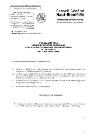 PROGRAMME E758 LANGUE ET CULTURE REGIONALES AIDE A LA SAUVEGARDE DES PARLERS ROMANS DU HAUT-RHIN (SECONDE LISTE 2009)