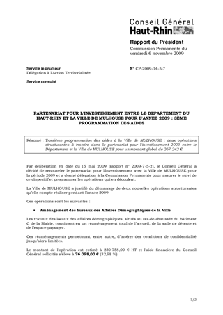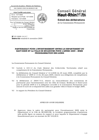 PARTENARIAT POUR L'INVESTISSEMENT ENTRE LE DEPARTEMENT DU HAUT-RHIN ET LA VILLE DE MULHOUSE POUR L'ANNEE 2009 : 3ÈME PROGRAMMATION DES AIDES