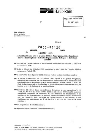 portant fixation du prix de journée 2005 du foyer pour adultes handicapés graves "Les Peupliers" du centre départemental de repos et de soins à COLMAR. Resumé Pièces jointes ARRETE Assemblée : Non défini Date : 10/03/2005 Rapporteur : Non défini Collectivité : Conseil départemental du Haut-Rhin Direction : Non défini Service : Service de la Tarification des Etablissements Domaine : Prix de Journée Commission :