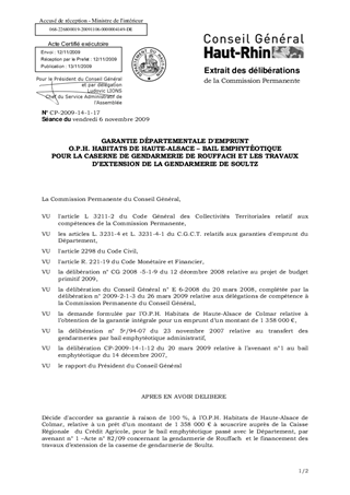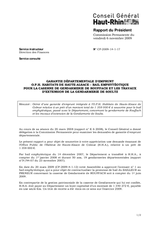 Octroi d’une garantie d'emprunt intégrale à l'O.P.H. Habitats de Haute-Alsace de Colmar relative à un prêt d’un montant total de 1 358 000 € à souscrire pour le bail emphytéotique, passé avec le Département, concernant la gendarmerie de Rouffach et les travaux d’extension de la Gendarmerie de Soultz.