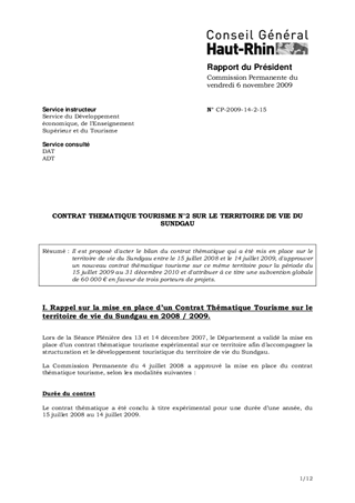 Il est proposé d'acter le bilan du contrat thématique qui a été mis en place sur le territoire de vie du Sundgau entre le 15 juillet 2008 et le 14 juillet 2009, d'approuver un nouveau contrat thématique tourisme sur ce même territoire pour la période du 15 juillet 2009 au 31 décembre 2010 et d'attribuer à ce titre une subvention globale de 60 000 € en faveur de trois porteurs de projets.