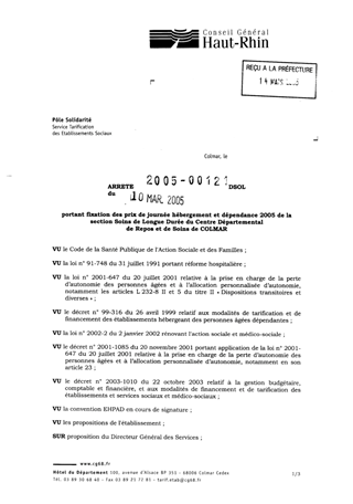 portant fixation des prix de journée hébergement et dépendance 2005 de la section soins de longue durée du centre départemental de repos et de soins de COLMAR. Resumé Pièces jointes ARRETE Assemblée : Non défini Date : 10/03/2005 Rapporteur : Non défini Collectivité : Conseil départemental du Haut-Rhin Direction : Non défini Service : Service de la Tarification des Etablissements Domaine : Prix de Journée Commission :