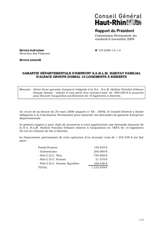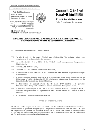 GARANTIE DÉPARTEMENTALE D'EMPRUNT S.A.H.L.M. HABITAT FAMILIAL D'ALSACE GROUPE DOMIAL 10 LOGEMENTS À SIERENTZ