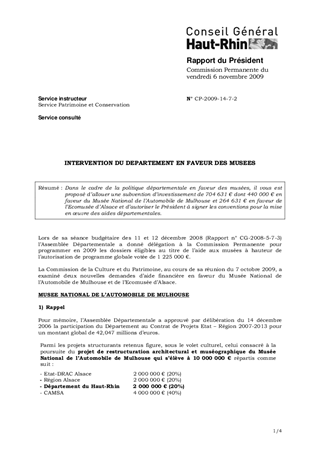 Dans le cadre de la politique départementale en faveur des musées, il vous est proposé d’allouer une subvention d’investissement de 704 631 € dont 440 000 € en faveur du Musée National de l’Automobile de Mulhouse et 264 631 € en faveur de l’Ecomusée d’Alsace et d’autoriser le Président à signer les conventions pour la mise en œuvre des aides départementales.