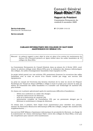 Le présent rapport a pour objet la mise en place d'un contrat de maintenance du réseau CPL (Courants porteurs en ligne) réalisé dans les salles banalisées de 43 collèges du Haut-Rhin.