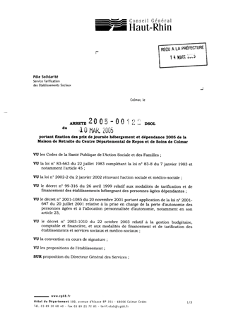 portant fixation des prix de journée hébergement et dépendance 2005 de la maison de retraite du centre départemental de repos et de soins de COLMAR. Resumé Pièces jointes ARRETE Assemblée : Non défini Date : 10/03/2005 Rapporteur : Non défini Collectivité : Conseil départemental du Haut-Rhin Direction : Non défini Service : Service de la Tarification des Etablissements Domaine : Prix de Journée Commission :