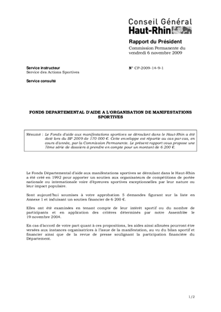 Le Fonds d'aide aux manifestations sportives se déroulant dans le Haut-Rhin a été doté lors du BP 2009 de 170 000 €. Cette enveloppe est répartie au cas par cas, en cours d'année, par la Commission Permanente. Le présent rapport vous propose une 7ème série de dossiers à prendre en compte pour un montant de 6 200 €.