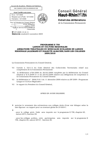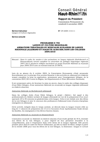 PROGRAMME E 758 LANGUE ET CULTURE REGIONALES ANIMATIONS THEATRALES OU MUSICALES SCOLAIRES EN LANGUE REGIONALE (ALLEMAND ET DIALECTE ALSACIEN) DANS LES COLLEGES 2009/2010