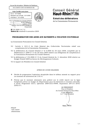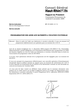 Dans le cadre de l’aide aux bâtiments à vocation culturelle, il vous est proposé de programmer définitivement une opération pour un montant de 2 351 €.