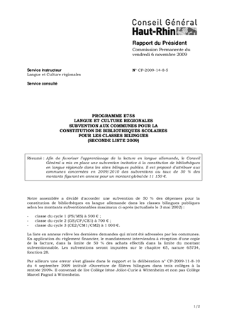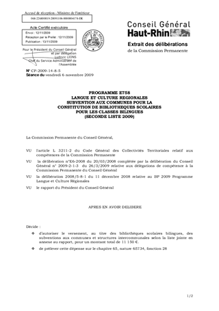 PROGRAMME E758 LANGUE ET CULTURE REGIONALES SUBVENTION AUX COMMUNES POUR LA CONSTITUTION DE BIBLIOTHEQUES SCOLAIRES POUR LES CLASSES BILINGUES (SECONDE LISTE 2009)