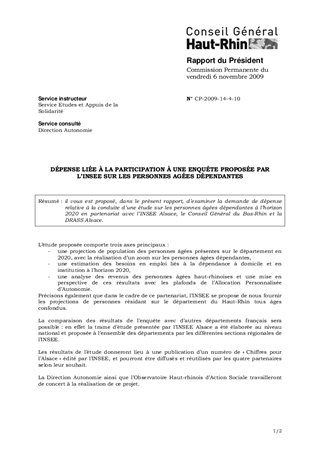 il vous est proposé, dans le présent rapport, d’examiner la demande de dépense relative à la conduite d’une étude sur les personnes âgées dépendantes à l’horizon 2020 en partenariat avec l’INSEE Alsace, le Conseil Général du Bas-Rhin et la DRASS Alsace.