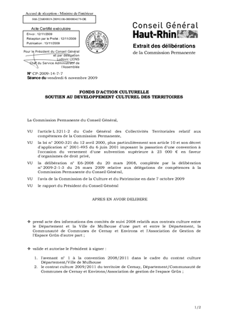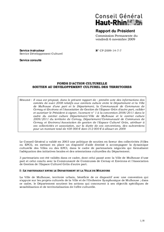 Il vous est proposé, dans le présent rapport de : prendre acte des informations des comités de suivi 2008 relatifs aux contrats culture entre le Département et la Ville de Mulhouse d'une part et le Département, la Communauté de Communes de Cernay et Environs et l'Association de Gestion de l'Espace Grün d'autre part, valider et autoriser le Président à signer, l'avenant n° 1 à la convention 2008/2011 dans le cadre du contrat culture Département/Ville de Mulhouse et le contrat culture 2009/2011 du territoire de Cernay, Département/Communauté de Communes de Cernay et Environs/Association de gestion de l'Espace Culturel Grün, attribuer à ces collectivités et association, sur la durée de ces conventions, des subventions pour un montant total de 438 000 € dont 312 000 € à allouer en 2009