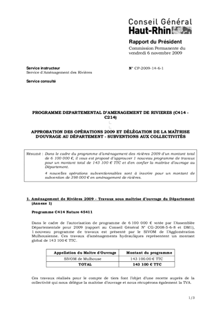 Dans le cadre du programme d’aménagement des rivières 2009 d'un montant total de 6 100 000 €, il vous est proposé d’approuver 1 nouveau programme de travaux pour un montant total de 143 100 € TTC et d'en confier la maîtrise d’ouvrage au Département. 4 nouvelles opérations subventionnables sont à inscrire pour un montant de subvention de 398 000 € en aménagement de rivières.