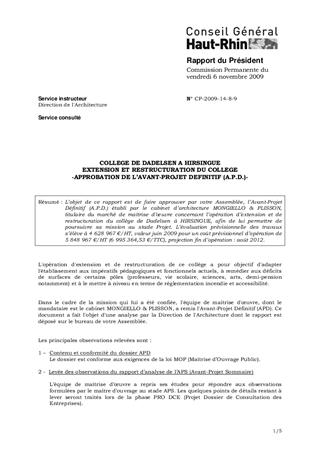 L’objet de ce rapport est de faire approuver par votre Assemblée, l’Avant-Projet Définitif (A.P.D.) établi par le cabinet d’architecture MONGIELLO & PLISSON, titulaire du marché de maîtrise d’œuvre concernant l’opération d’extension et de restructuration du collège de Dadelsen à HIRSINGUE, afin de lui permettre de poursuivre sa mission au stade Projet. L’évaluation prévisionnelle des travaux s’élève à 4 628 967 €/HT, valeur juin 2009 pour un coût prévisionnel d’opération de 5 848 967 €/HT (6 995 364,53 €/TTC), projection fin d’opération : août 2012.