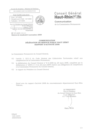 Le présent rapport propose de prendre acte du rapport d’activité 2008 du délégataire de service public haut débit, Haut-Rhin Télécom.