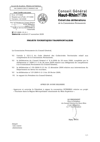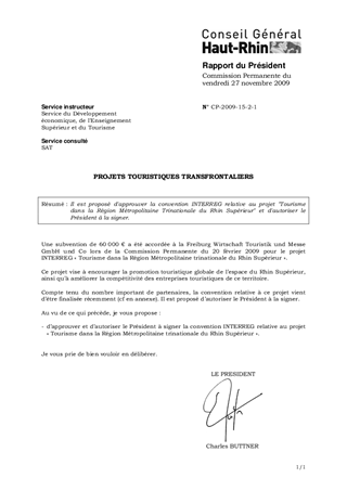 Il est proposé d'approuver la convention INTERREG relative au projet "Tourisme dans la Région Métropolitaine Trinationale du Rhin Supérieur" et d'autoriser le Président à la signer.