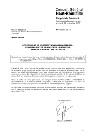 Le présent rapport a pour objet la signature de conventions d'occupation précaire de logements aux collèges Victor SCHOELCHER à ENSISHEIM et Robert SCHUMAN à VOLGELSHEIM.