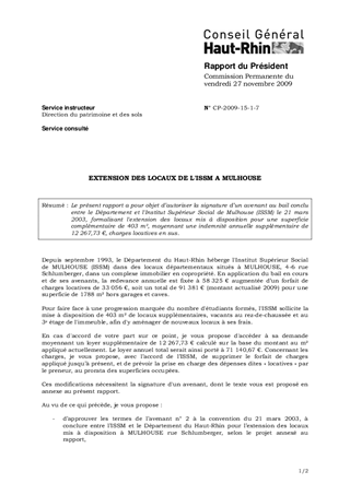 Le présent rapport a pour objet d’autoriser la signature d’un avenant au bail conclu entre le Département et l'Institut Supérieur Social de Mulhouse (ISSM) le 21 mars 2003, formalisant l'extension des locaux mis à disposition pour une superficie complémentaire de 403 m², moyennant une indemnité annuelle supplémentaire de 12 267,73 €, charges locatives en sus.
