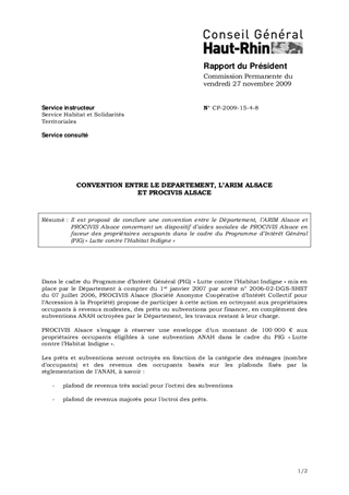 Il est proposé de conclure une convention entre le Département, l’ARIM Alsace et PROCIVIS Alsace concernant un dispositif d’aides sociales de PROCIVIS Alsace en faveur des propriétaires occupants dans le cadre du Programme d’Intérêt Général (PIG) « Lutte contre l’Habitat Indigne »