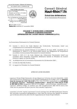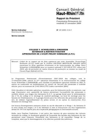 L’objet de ce rapport est de faire approuver par votre Assemblée l’Avant-Projet Sommaire (A.P.S.) établi par le Cabinet ARCANES MINOTAURE ROLAND SPITZ concernant la 2ème opération d’extension et de restructuration du collège Victor Schoelcher à ENSISHEIM, pour un montant estimatif 3 525 000 €/TTC, valeur juin 2009, afin de permettre au maître d’œuvre de poursuivre sa mission au stade de l’Avant-Projet Définitif (A.P.D.).