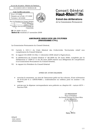 Dans le cadre du Budget Primitif 2009, un montant de 9.000 € a été inscrit au titre de l’assurance grêle sur les cultures (rapport CG 2008 5-6-9). La contribution départementale est versée aux compagnies d’assurance qui en affectent le montant aux primes et cotisations dues par les exploitants assurés. Le GROUPAMA nous a transmis les justificatifs pour un montant de 8.912,00 € détaillé dans l’annexe 1 ci-jointe.