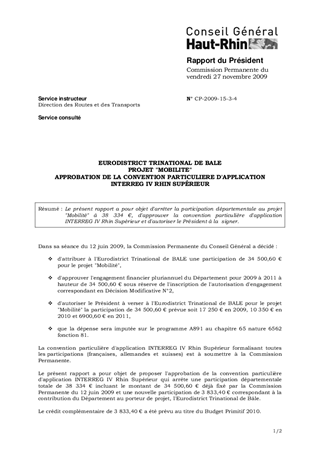 Le présent rapport a pour objet d'arrêter la participation départementale au projet "Mobilité" à 38 334 €, d'approuver la convention particulière d'application INTERREG IV Rhin Supérieur et d'autoriser le Président à la signer.