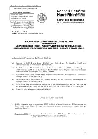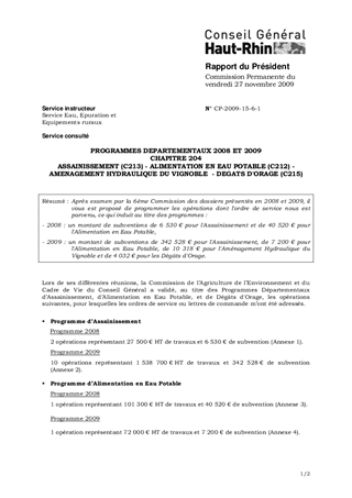 PROGRAMMES DEPARTEMENTAUX 2008 ET 2009 CHAPITRE 204 ASSAINISSEMENT (C213) - ALIMENTATION EN EAU POTABLE (C212) - AMENAGEMENT HYDRAULIQUE DU VIGNOBLE - DEGATS D'ORAGE (C215)