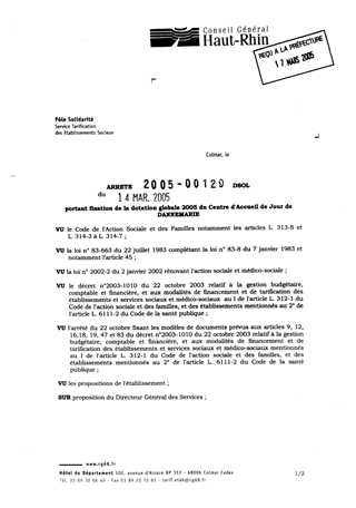 portant fixation de la dotation globale 2005 du centre d'accueil de jour de DANNEMARIE. Resumé Pièces jointes ARRETE Assemblée : Non défini Date : 14/03/2005 Rapporteur : Non défini Collectivité : Conseil départemental du Haut-Rhin Direction : Non défini Service : Service de la Tarification des Etablissements Domaine : Accueil d'enfants Commission :