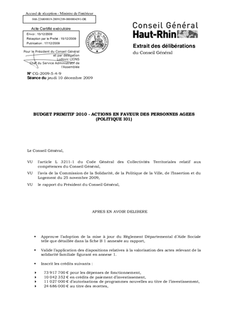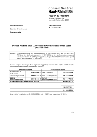 BUDGET PRIMITIF 2010 - ACTIONS EN FAVEUR DES PERSONNES AGEES (POLITIQUE I01)