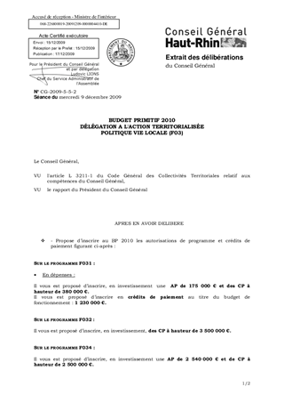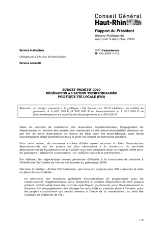 BUDGET PRIMITIF 2010 DÉLÉGATION A L'ACTION TERRITORIALISÉE POLITIQUE VIE LOCALE (F03)