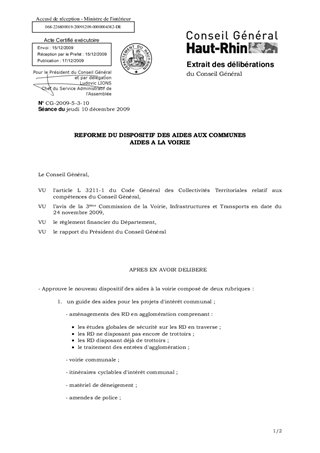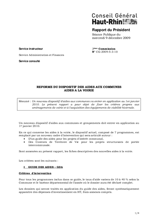 Un nouveau dispositif d'aides aux communes va entrer en application au 1er janvier 2010. Le présent rapport a pour objet de fixer les critères propres aux aménagements de voirie et à l'acquisition des équipements de viabilité hivernale.