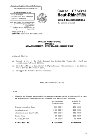 BUDGET PRIMITIF 2010 EAU (CO1) ASSAINISSEMENT - EAU POTABLE - EXCES D'EAU