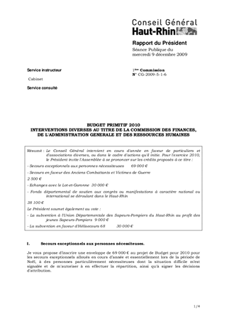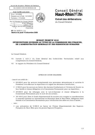 BUDGET PRIMITIF 2010 INTERVENTIONS DIVERSES AU TITRE DE LA COMMISSION DES FINANCES, DE L'ADMINISTRATION GENERALE ET DES RESSOURCES HUMAINES