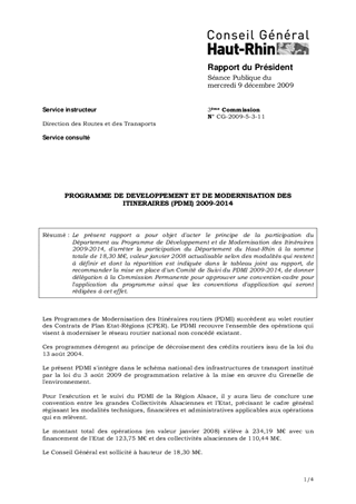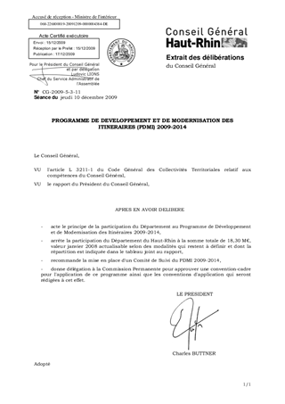 Le présent rapport a pour objet d'acter le principe de la participation du Département au Programme de Développement et de Modernisation des Itinéraires 2009-2014, d'arrêter la participation du Département du Haut-Rhin à la somme totale de 18,30 M€, valeur janvier 2008 actualisable selon des modalités qui restent à définir et dont la répartition est indiquée dans le tableau joint au rapport, de recommander la mise en place d'un Comité de Suivi du PDMI 2009-2014, de donner délégation à la Commission Permanente pour approuver une convention-cadre pour l'application du programme ainsi que les conventions d'application qui seront rédigées à cet effet.