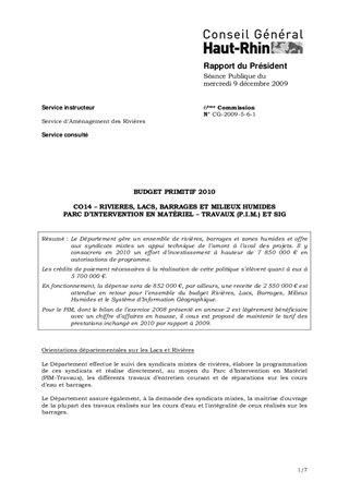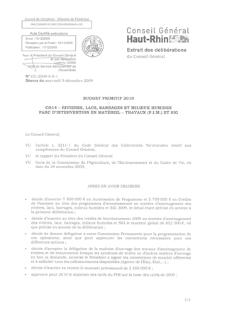 BUDGET PRIMITIF 2010CO14 – RIVIERES, LACS, BARRAGES ET MILIEUX HUMIDESPARC D’INTERVENTION EN MATÉRIEL – TRAVAUX (P.I.M.) ET SIG