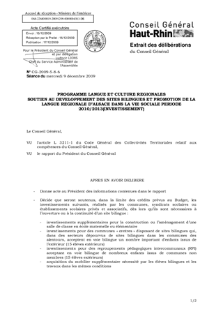 PROGRAMME LANGUE ET CULTURE REGIONALES SOUTIEN AU DEVELOPPEMENT DES SITES BILINGUES ET PROMOTION DE LA LANGUE REGIONALE D’ALSACE DANS LA VIE SOCIALE PERIODE 2010/2013(INVESTISSEMENT)