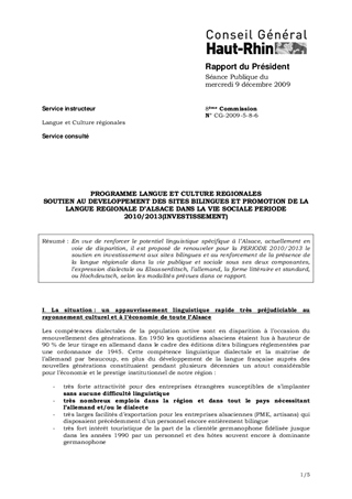 En vue de renforcer le potentiel linguistique spécifique à l’Alsace, actuellement en voie de disparition, il est proposé de renouveler pour la PERIODE 2010/2013 le soutien en investissement aux sites bilingues et au renforcement de la présence de la langue régionale dans la vie publique et sociale sous ses deux composantes, l’expression dialectale ou Elsasserditsch, l’allemand, la forme littéraire et standard, ou Hochdeutsch, selon les modalités prévues dans ce rapport.