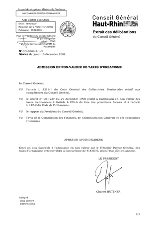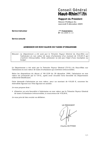 Le Département a été saisi par le Trésorier Payeur Général du Haut-Rhin sur l’admission en non valeur de taxes d’urbanisme d’un montant de 418,00 € qui s’avèrent irrécouvrables. Cette admission ne fait pas l’objet d’une inscription au budget.