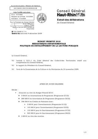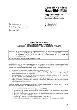 BUDGET PRIMITIF 2010 MEDIATHEQUE DEPARTEMENTALE POLITIQUE DE DEVELOPPEMENT DE LA LECTURE PUBLIQUE