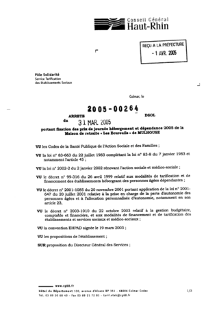 portant fixation des prix de journée hébergement et dépendance 2005 de la Maison de retraite "Les Ecureuils" de MULHOUSE. Resumé Pièces jointes ARRETE Assemblée : Non défini Date : 31/03/2005 Rapporteur : Non défini Collectivité : Conseil départemental du Haut-Rhin Direction : Non défini Service : Service de la Tarification des Etablissements Domaine : Prix de Journée Commission :
