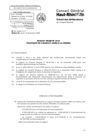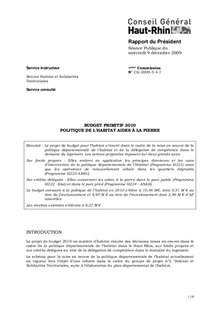 BUDGET PRIMITIF 2010 POLITIQUE DE L'HABITAT AIDES À LA PIERRE