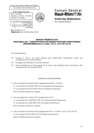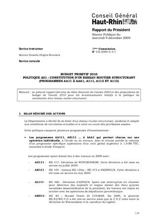 Le présent rapport fait état du bilan financier de l'année 2009 et des propositions de budget de l'année 2010 pour les investissements relatifs à la politique de constitution d'un réseau routier structurant