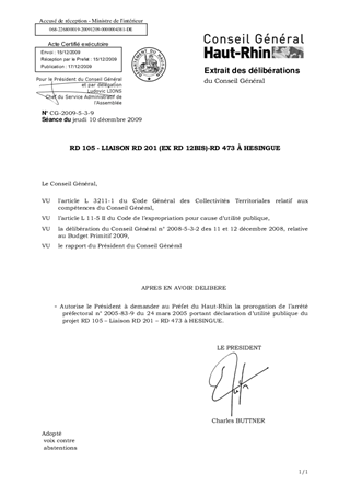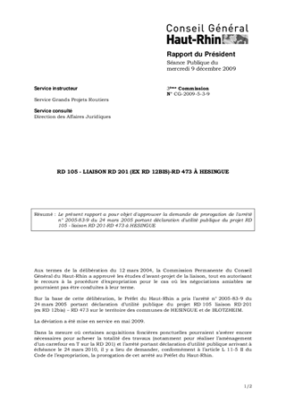 Le présent rapport a pour objet d'approuver la demande de prorogation de l'arrêté n° 2005-83-9 du 24 mars 2005 portant déclaration d'utilité publique du projet RD 105 - liaison RD 201-RD 473 à HESINGUE