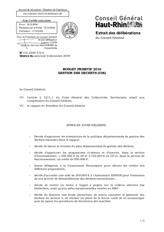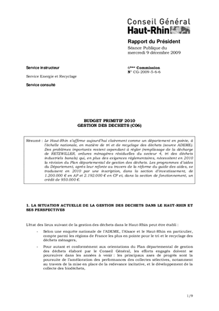 Le Haut-Rhin s’affirme aujourd’hui clairement comme un département en pointe, à l’échelle nationale, en matière de tri et de recyclage des déchets (source ADEME). Des problèmes importants restent cependant à régler (remplissage de la décharge de RETZWILLER, ordures ménagères résiduelles du secteur 4, tri des déchets industriels banals) qui, en plus des exigences réglementaires, nécessitent en 2010 la révision du Plan départemental de gestion des déchets. Les programmes d’aides du Département, après leur refonte au travers de la réforme du guide des aides, se traduisent en 2010 par une inscription, dans la section d’investissement, de 1.200.000 € en AP et 2.192.000 € en CP et, dans la section de fonctionnement, un crédit de 950.000 €.