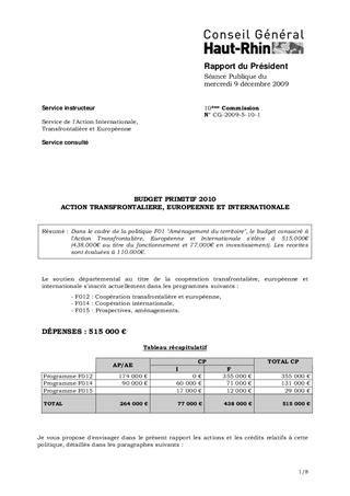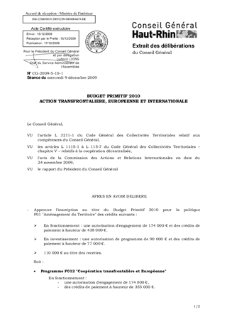 BUDGET PRIMITIF 2010 ACTION TRANSFRONTALIERE, EUROPEENNE ET INTERNATIONALE