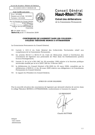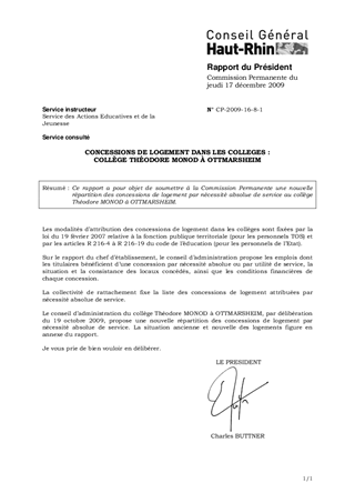 Ce rapport a pour objet de soumettre à la Commission Permanente une nouvelle répartition des concessions de logement par nécessité absolue de service au collège Théodore MONOD à OTTMARSHEIM.